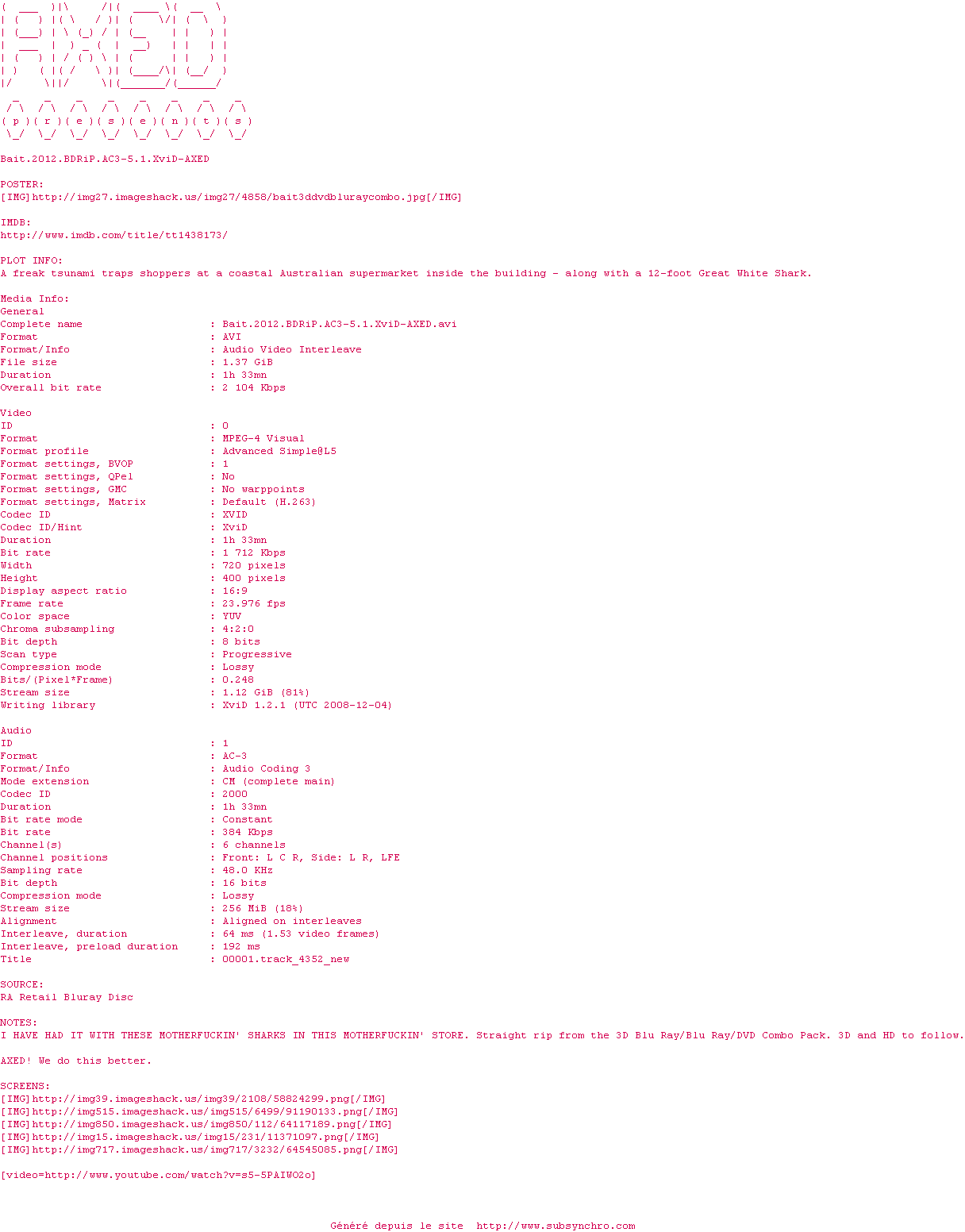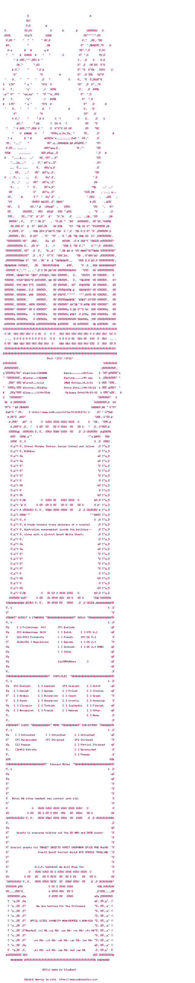 Le commentaire de Nuclear Commente par Nuclear (398), Le Dimanche 28 Octobre 2012 à 19h15 Si Bait est navrant pour son scénario de pacotille et son suspens réchauffé, les incursions sanglantes du squale sont vraiment électrisantes ! 4 / 10 0 0
