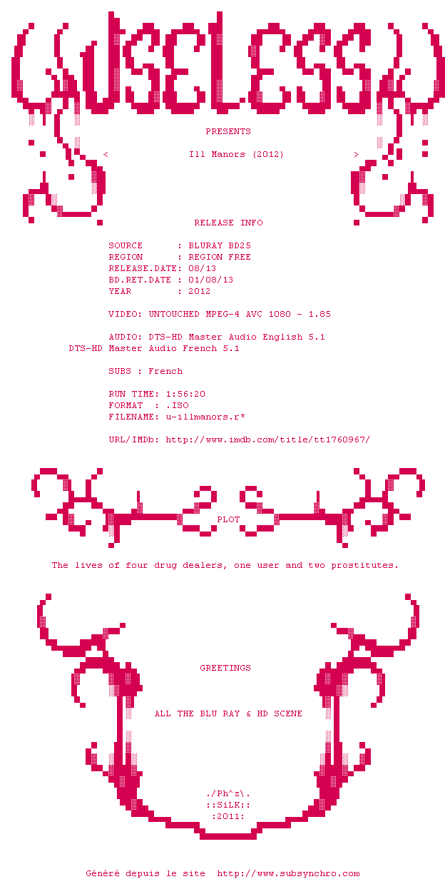 | Voir le nfo de la release Ill.Manors.2012.MULTi.COMPLETE.BLURAY-USELESS | USELESS | Ill.Manors.2012.MULTi.COMPLETE.BLURAY-USELESS OpenSubtitles | 0 fichier | ||