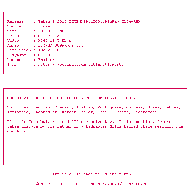 Loin derrière le premier opus qui assumait complètement son côté bas du front, Taken 2 transpire l'égocentrisme crétin américain et consacre Olivier Megaton, imposteur notoire, pire créateur de cinéma-poubelle.