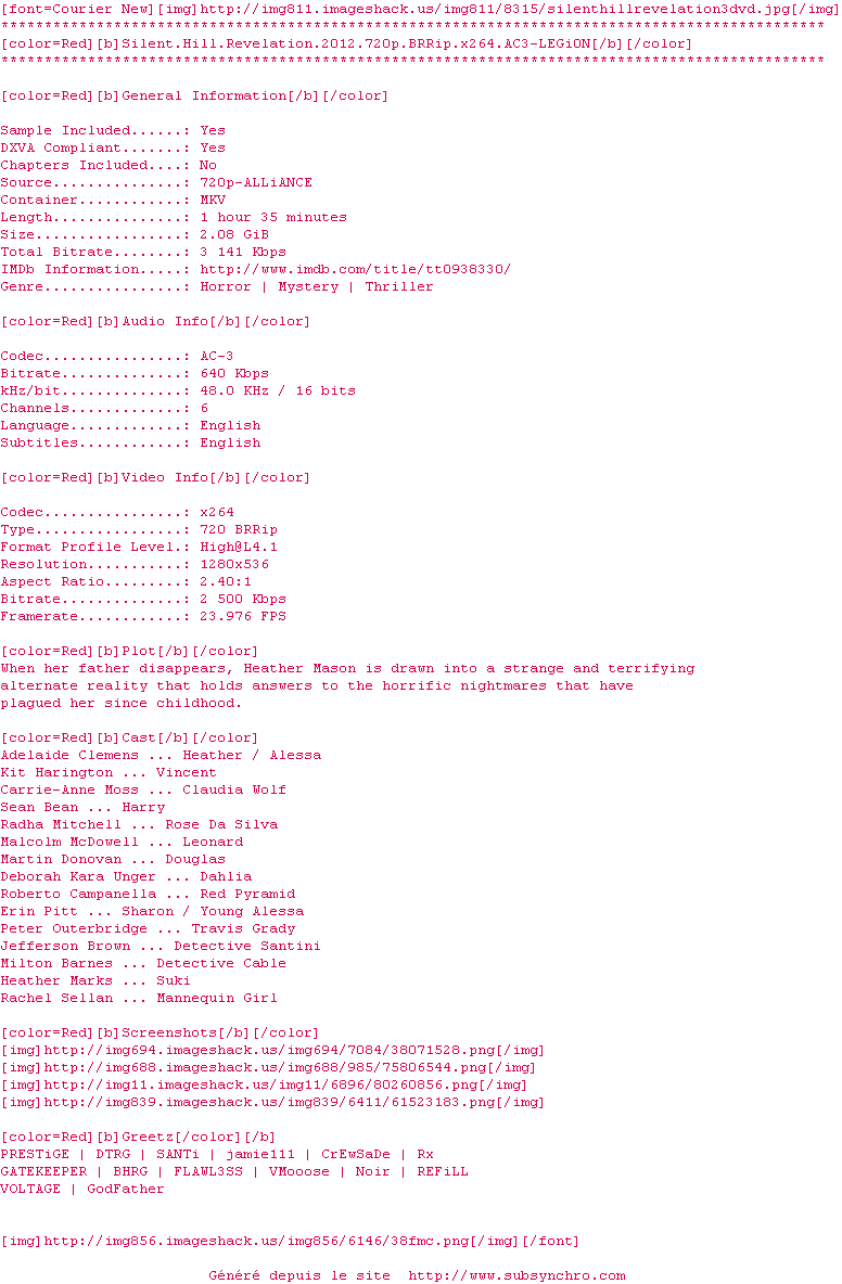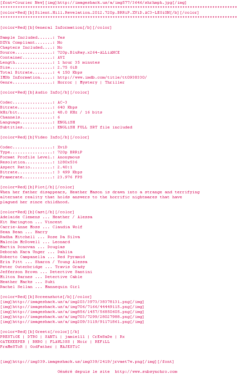 Voir le nfo de la release Silent.Hill.Revelation.2012.720p.BRRiP.XViD.AC3-LEGi0N