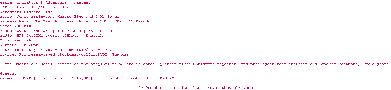 | Voir le nfo de la release The.Swan.Princess.Christmas.2012.DVDRip.XViD-sC0rp | sC0rp | The.Swan.Princess.Christmas.2012.DVDRip.XViD-sC0rp OpenSubtitles | 0 fichier |