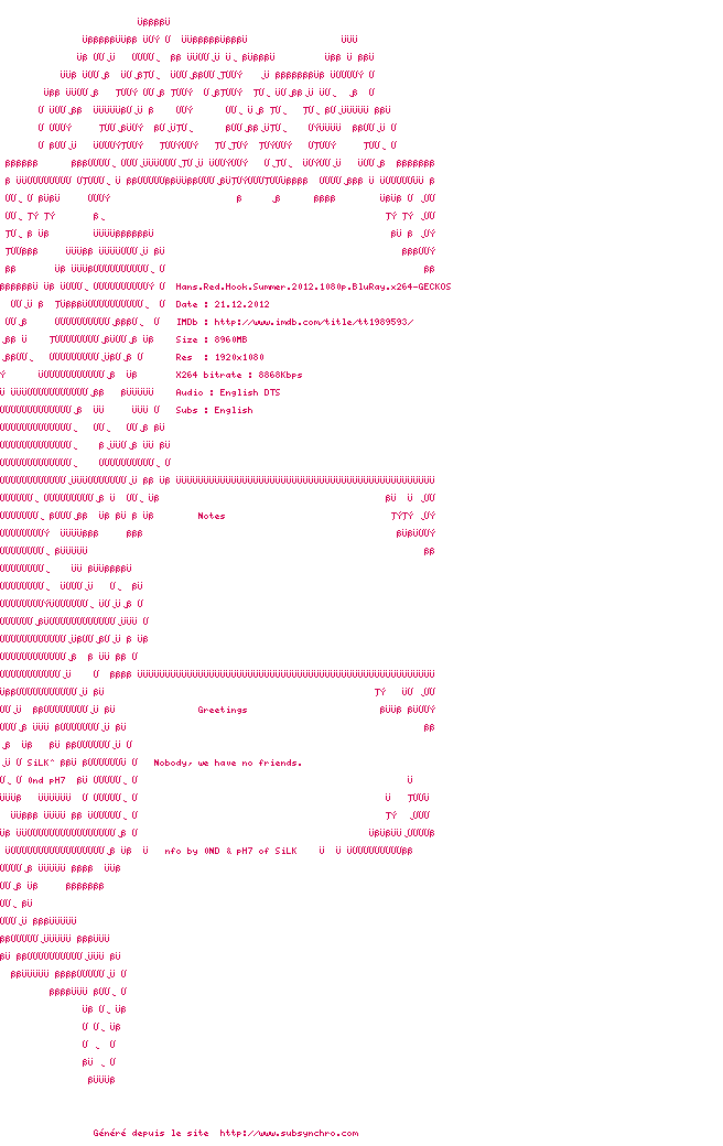 | Voir le nfo de la release Red.Hook.Summer.2012.1080p.BluRay.x264-GECKOS | GECKOS | Red.Hook.Summer.2012.1080p.BluRay.x264-GECKOS OpenSubtitles | 0 fichier | ||