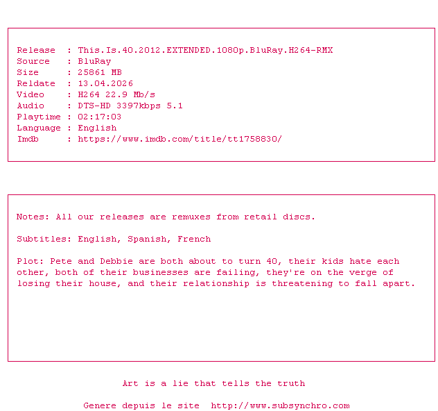 Y avez-vous pense ? Nous proposons déjà 1660 sous-titres pour le film 40 ans : Mode d'emploi. Avez-vous essaye de voir si ces sous-titres etaient compatibles avec cette release ? On vous laisse le soin de tester cela pour nous et de contribuer au site en postant le sous-titre en cas de compatiblite constatee !