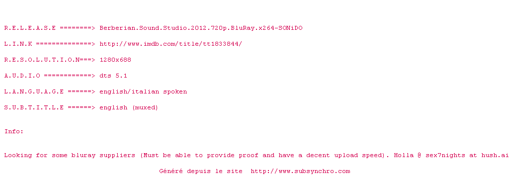 Voir le nfo de la release Berberian.Sound.Studio.2012.1080p.BluRay.x264-SONiDO