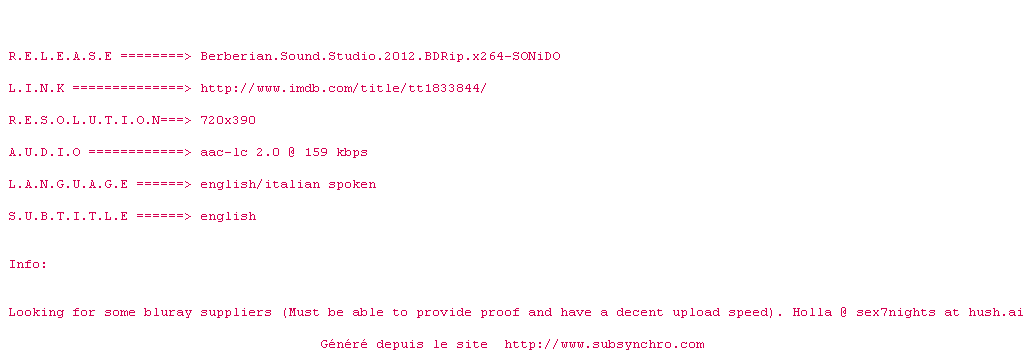 Voir le nfo de la release Berberian.Sound.Studio.2012.720p.BluRay.x264-SONiDO