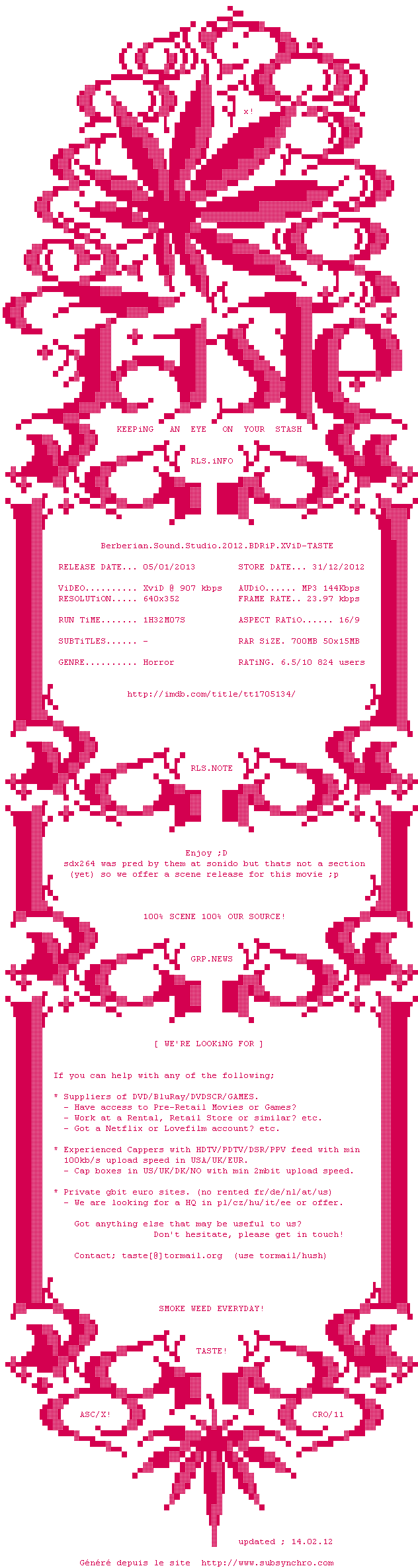 Voir le nfo de la release Berberian.Sound.Studio.2012.BDRiP.XViD-TASTE
