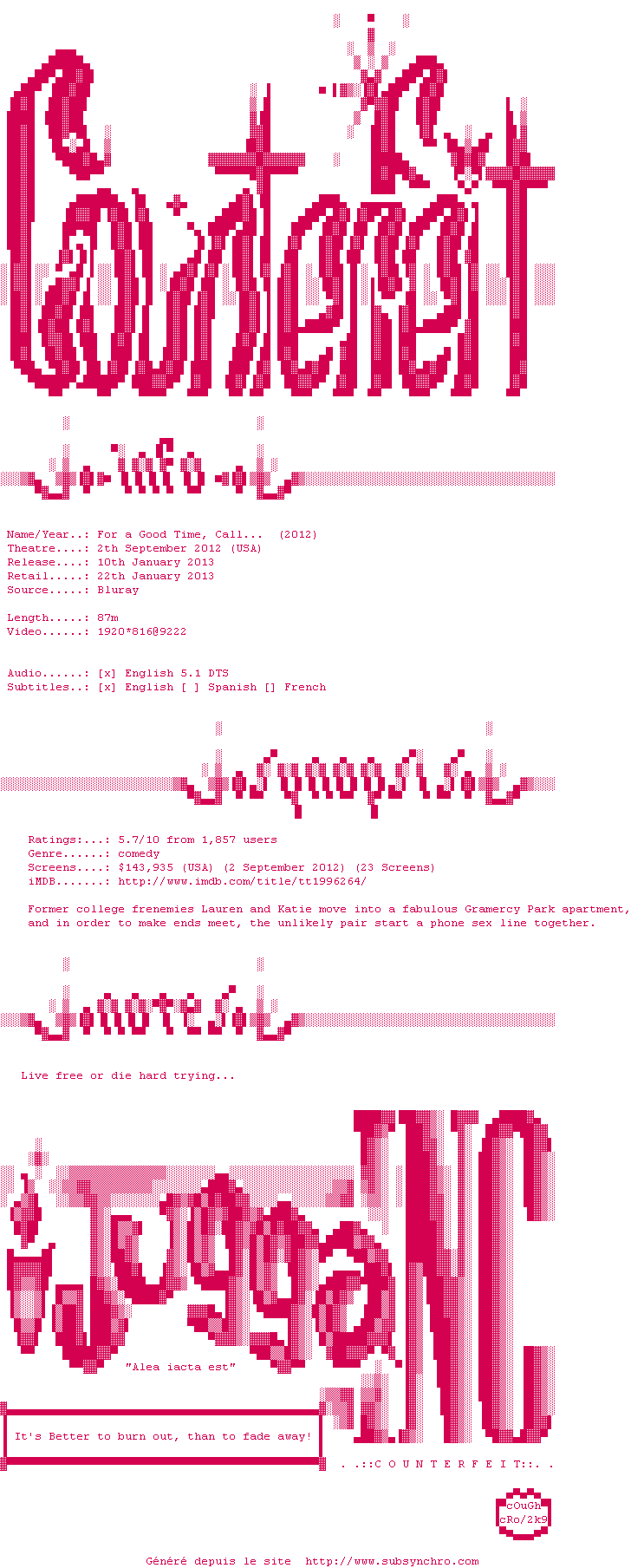 Voir le nfo de la release For.A.Good.Time.Call.2012.LIMITED.UNRATED.1080p.BluRay.x264-Counterfeit