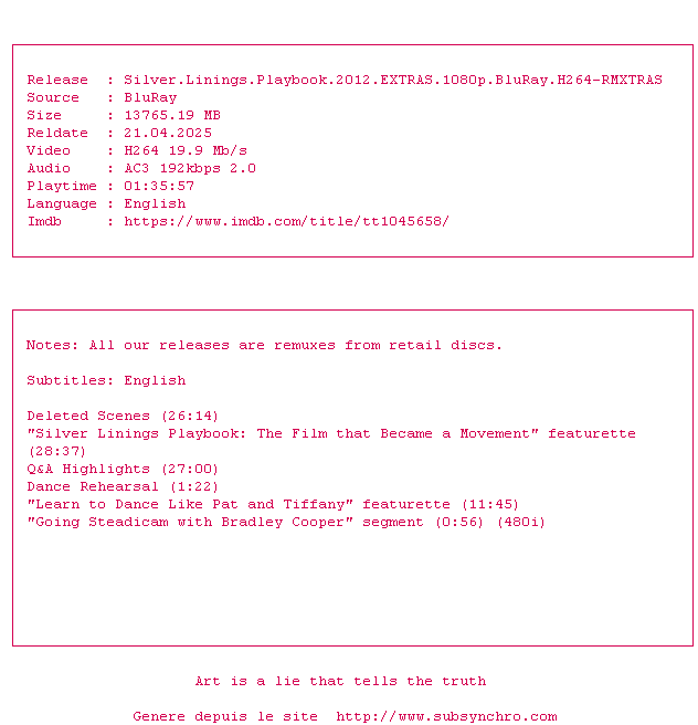 Voir le nfo de la release Silver.Linings.Playbook.2012.EXTRAS.1080p.BluRay.H264-RMXTRAS