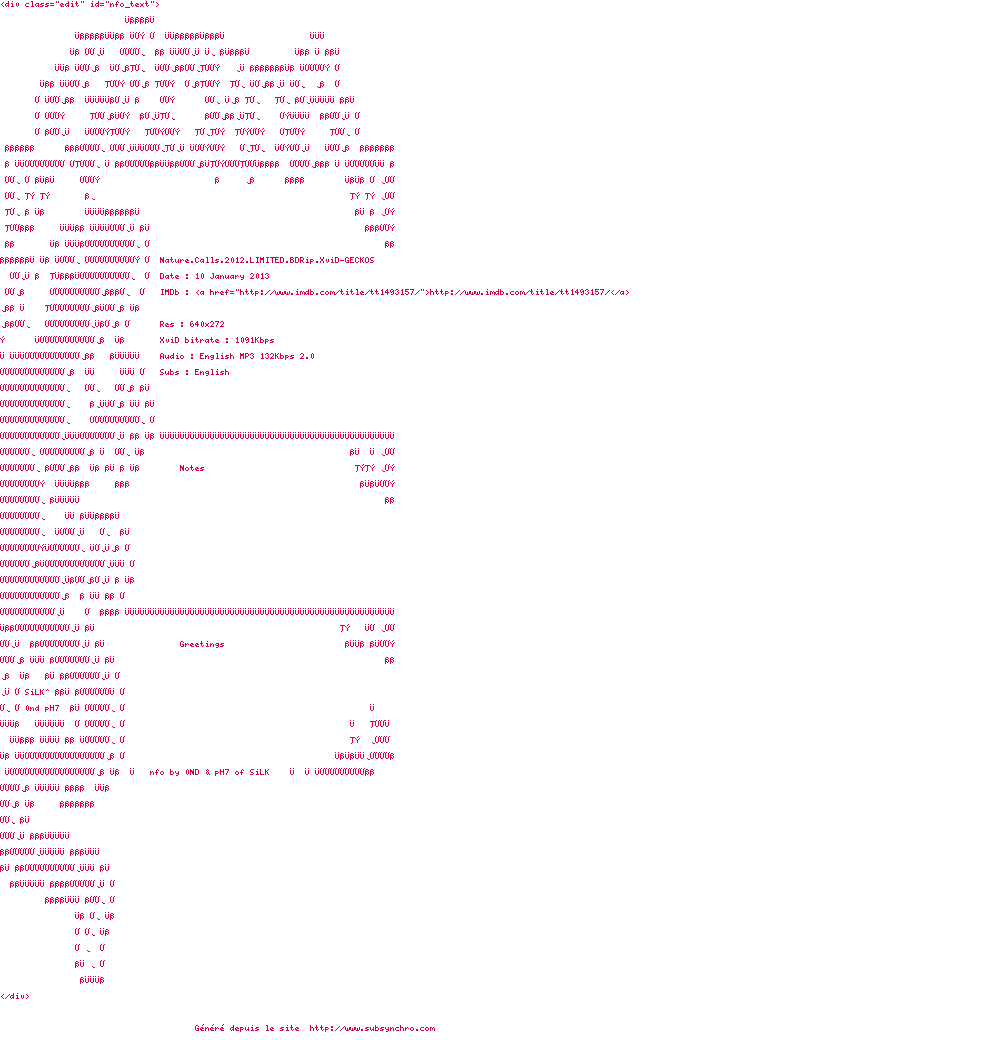 Voir le nfo de la release Nature.Calls.2012.LIMITED.BDRip.XviD-GECKOS