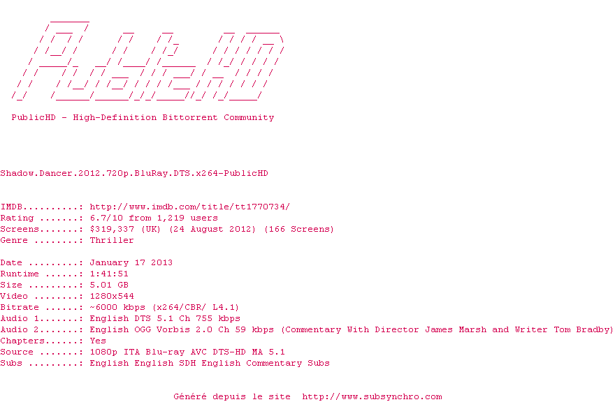Voir le nfo de la release Shadow.Dancer.2012.1080p.BluRay.DTS.x264-PublicHD