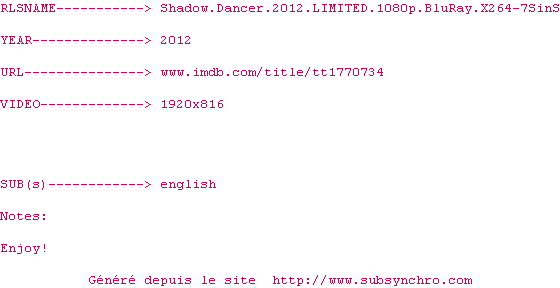 Voir le nfo de la release Shadow.Dancer.2012.LIMITED.1080p.BluRay.x264-7SinS