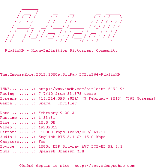 Voir le nfo de la release The.Impossible.2012.720p.BluRay.DTS.x264-PublicHD