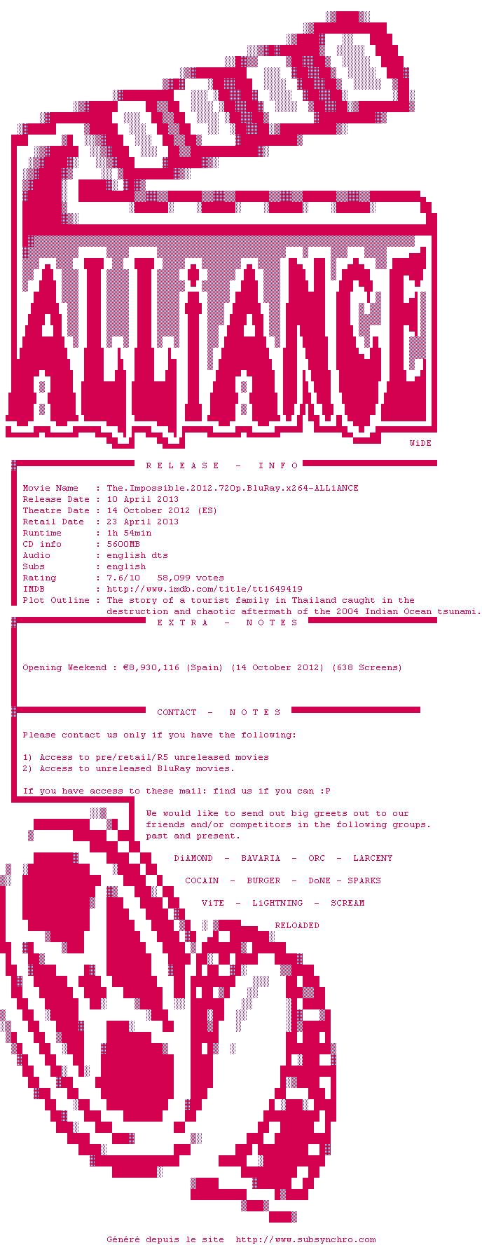 Voir le nfo de la release The.Impossible.2012.720p.BluRay.x264-ALLiANCE