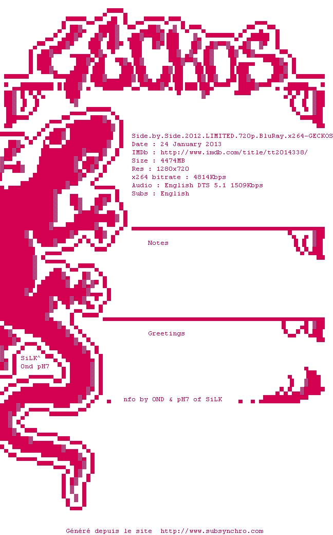 Voir le nfo de la release Side.By.Side.2012.LIMITED.720p.BluRay.x264-GECKOS