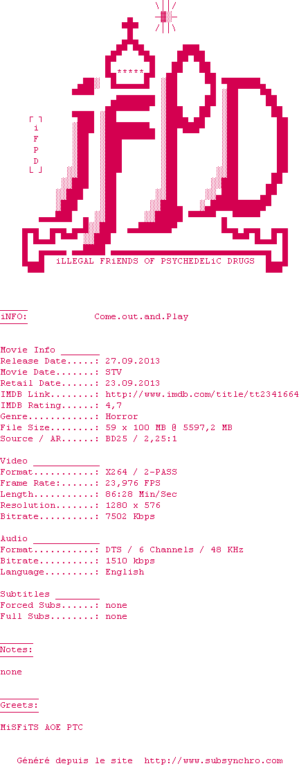 | Voir le nfo de la release Come.out.and.Play.2012.1080p.BluRay.x264-iFPD | iFPD | Come.out.and.Play.2012.1080p.BluRay.x264-iFPD OpenSubtitles | 0 fichier |