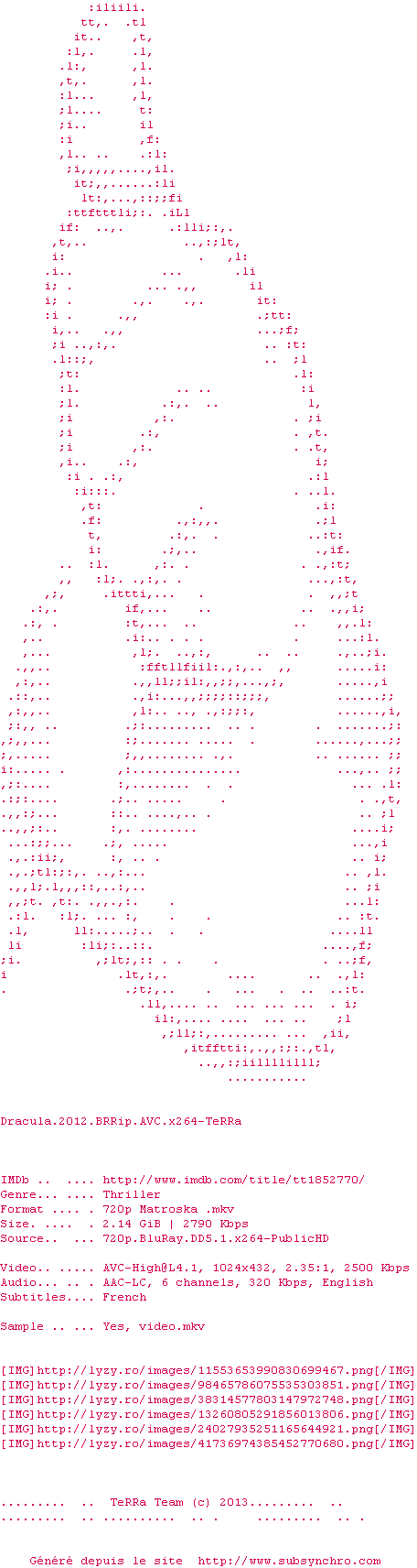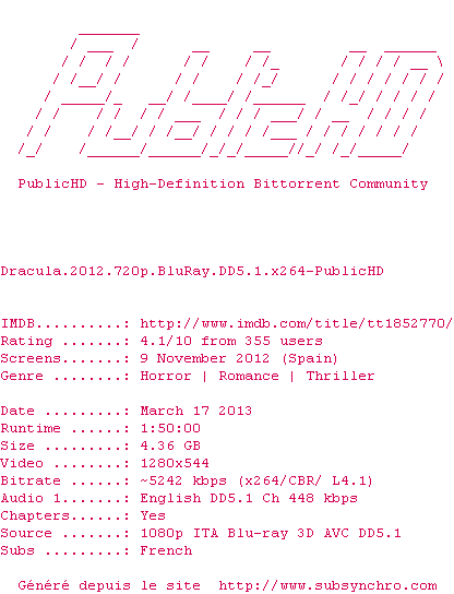 Voir le nfo de la release Dracula.2012.1080p.BluRay.DD5.1.x264-PublicHD