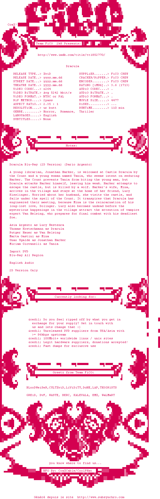 Voir le nfo de la release Dracula.2012.1080p.BluRay.x264-FiCO