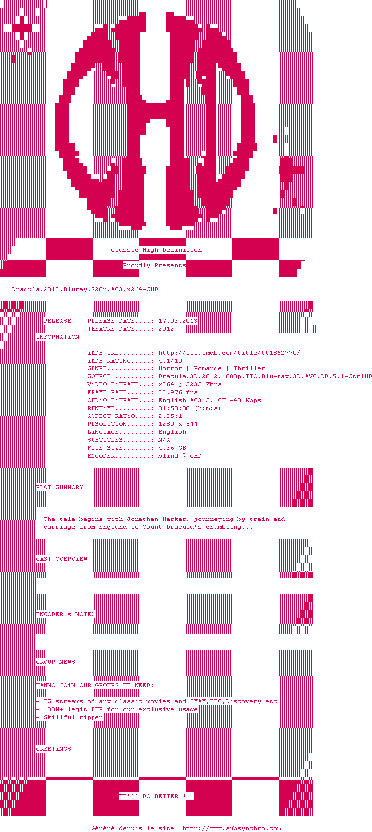 Voir le nfo de la release Dracula.2012.Bluray.720p.AC3.x264-CHD