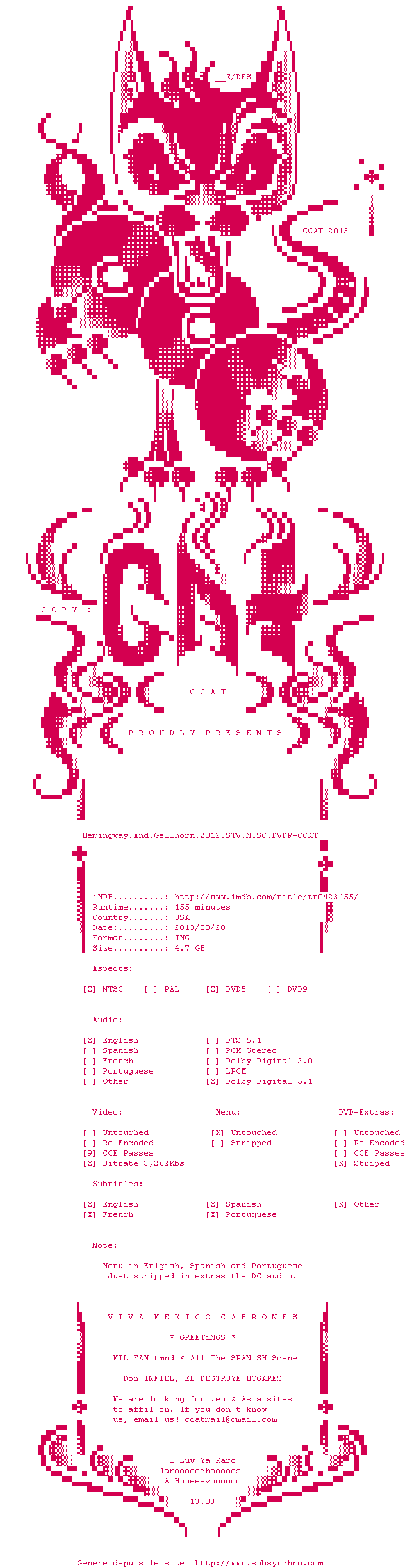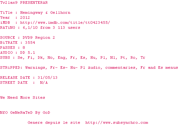 Voir le nfo de la release Hemingway.And.Gellhorn.2012.MULTi.PAL.DVDR-BFHDVD