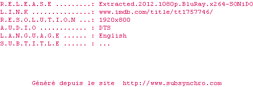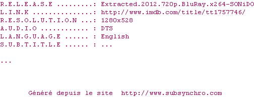 | Voir le nfo de la release Extracted.2012.1080p.BluRay.x264-SONiDO | SONiDO | Extracted.2012.1080p.BluRay.x264-SONiDO OpenSubtitles | 0 fichier | ||