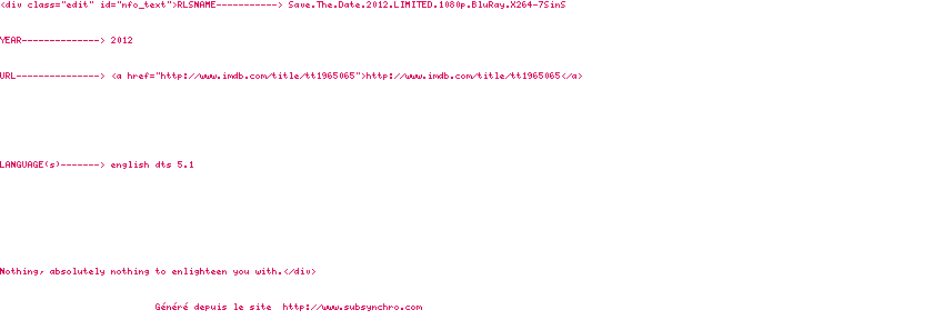 Voir le nfo de la release Save.The.Date.2012.LIMITED.1080p.BluRay.X264-7SinS