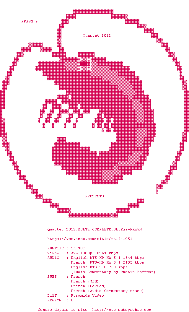 Y avez-vous pense ? Nous proposons déjà 1660 sous-titres pour le film Quartet. Avez-vous essaye de voir si ces sous-titres etaient compatibles avec cette release ? On vous laisse le soin de tester cela pour nous et de contribuer au site en postant le sous-titre en cas de compatiblite constatee !