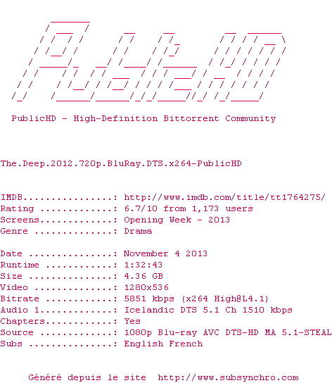 | Voir le nfo de la release The.Deep.2012.720p.BluRay.DTS.x264-PublicHD | PublicHD | The.Deep.2012.720p.BluRay.DTS.x264-PublicHD OpenSubtitles | 0 fichier |