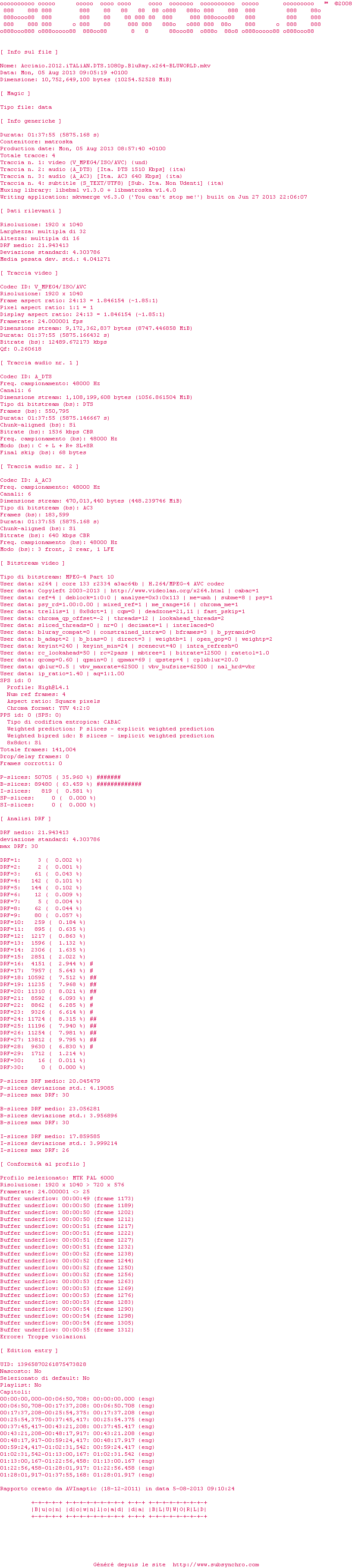 Voir le nfo de la release Acciaio.2012.iTALiAN.DTS.1080p.BluRay.x264-BLUWORLD