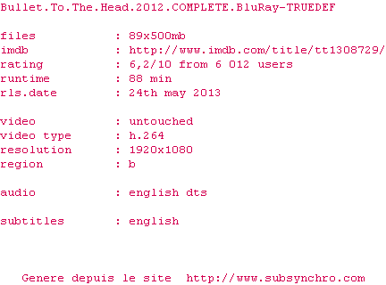 Voir le nfo de la release Bullet.To.The.Head.2012.COMPLETE.BluRay-TRUEDEF