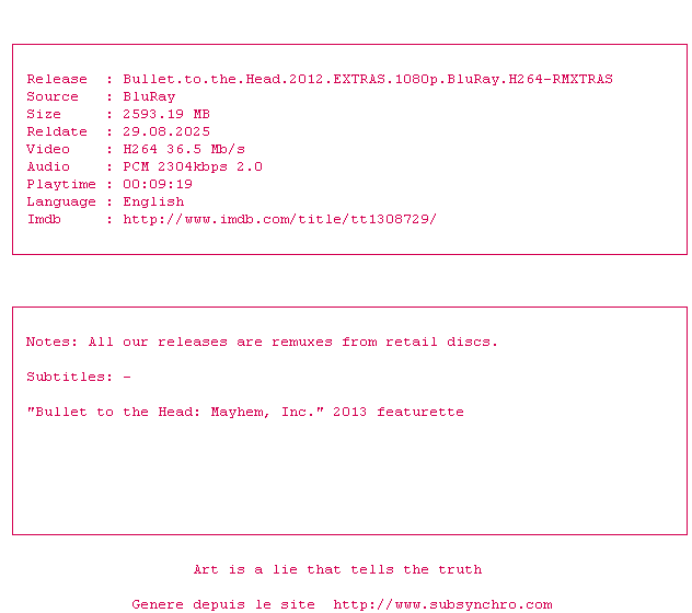 Voir le nfo de la release Bullet.To.The.Head.2012.EXTRAS.1080p.BluRay.H264-RMXTRAS