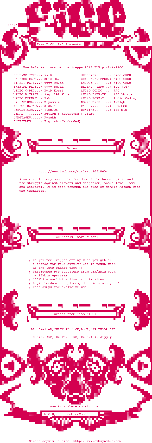 Voir le nfo de la release Myn.Bala.Warriors.of.the.Steppe.2012.BDRip.x264-FiCO