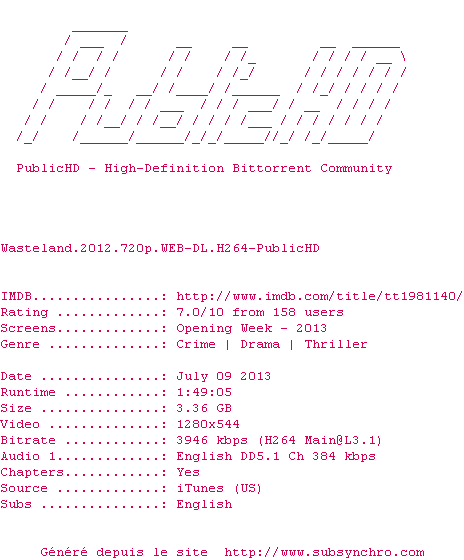 | BiTo | Wasteland.2012.WEB-DL.x264.AC3-BiTo OpenSubtitles | 0 fichier | |||