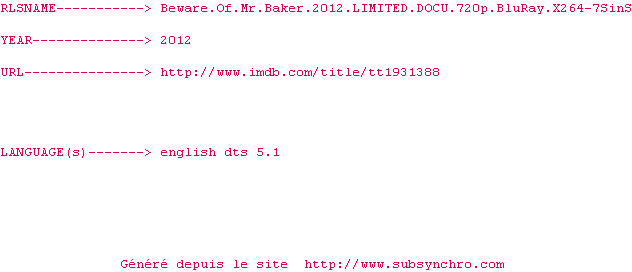 Voir le nfo de la release Beware.Of.Mr.Baker.2012.LIMITED.DOCU.1080p.BluRay.X264-7SinS