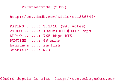 | Voir le nfo de la release Piranhaconda.2012.720p.BluRay.x264-MELiTE | MELiTE | Piranhaconda.2012.720p.BluRay.x264-MELiTE OpenSubtitles | 0 fichier | ||