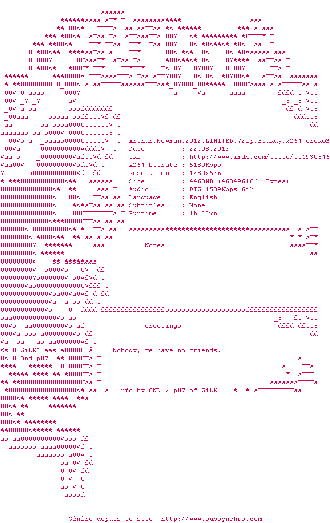 Voir le nfo de la release Arthur.Newman.2012.LIMITED.1080p.BluRay.x264-GECKOS