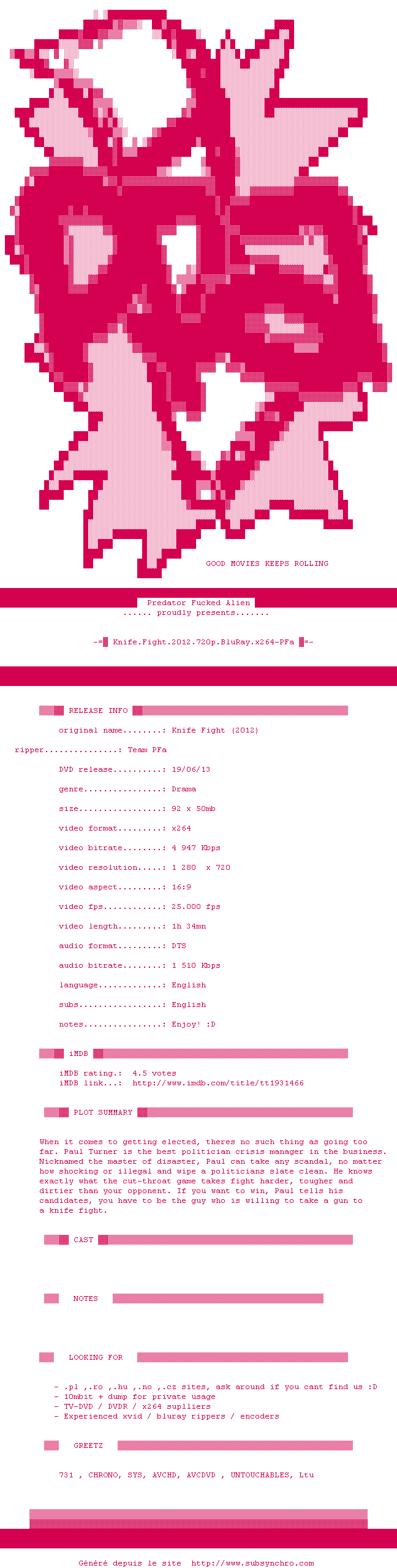 | Voir le nfo de la release Knife.Fight.2012.1080p.BluRay.x264-PFa | PFa | Knife.Fight.2012.1080p.BluRay.x264-PFa OpenSubtitles | 0 fichier |