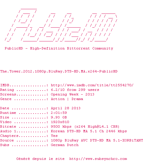Voir le nfo de la release The.Tower.2012.720p.BluRay.DTS.x264-PublicHD
