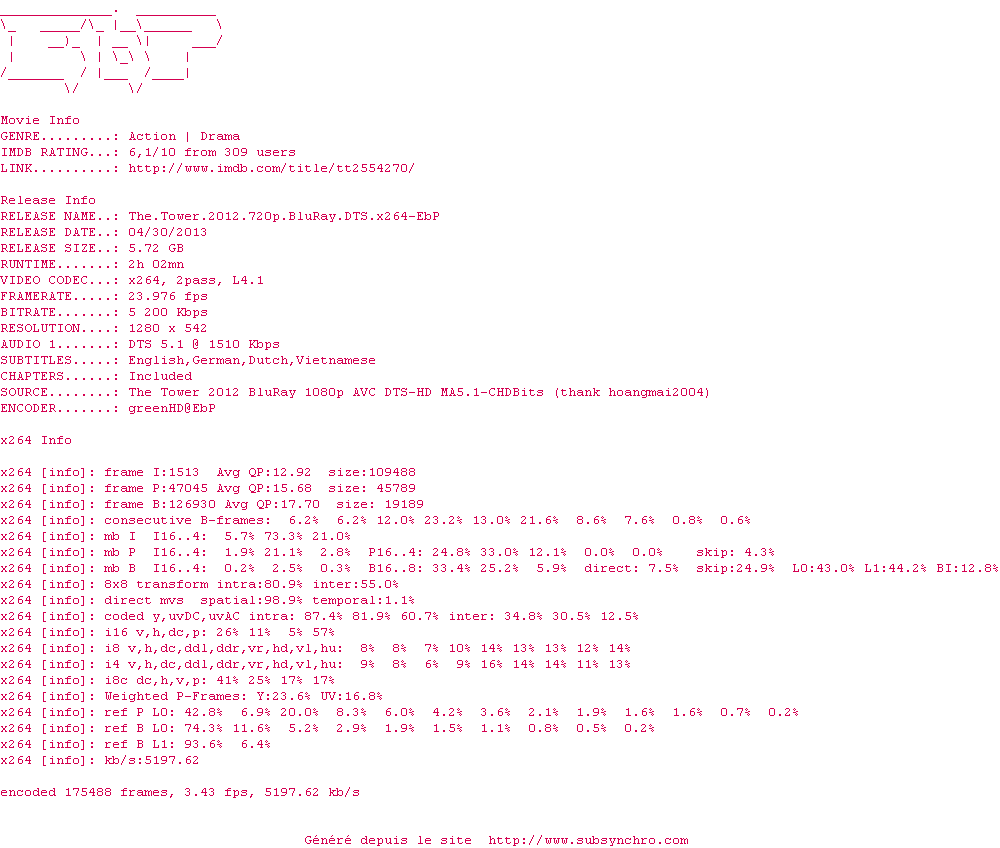 Voir le nfo de la release The.Tower.2012.720p.BluRay.DTS.x264-EbP