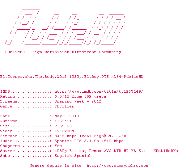 Voir le nfo de la release El.Cuerpo.aka.The.Body.2012.720p.BluRay.DTS.x264-PublicHD