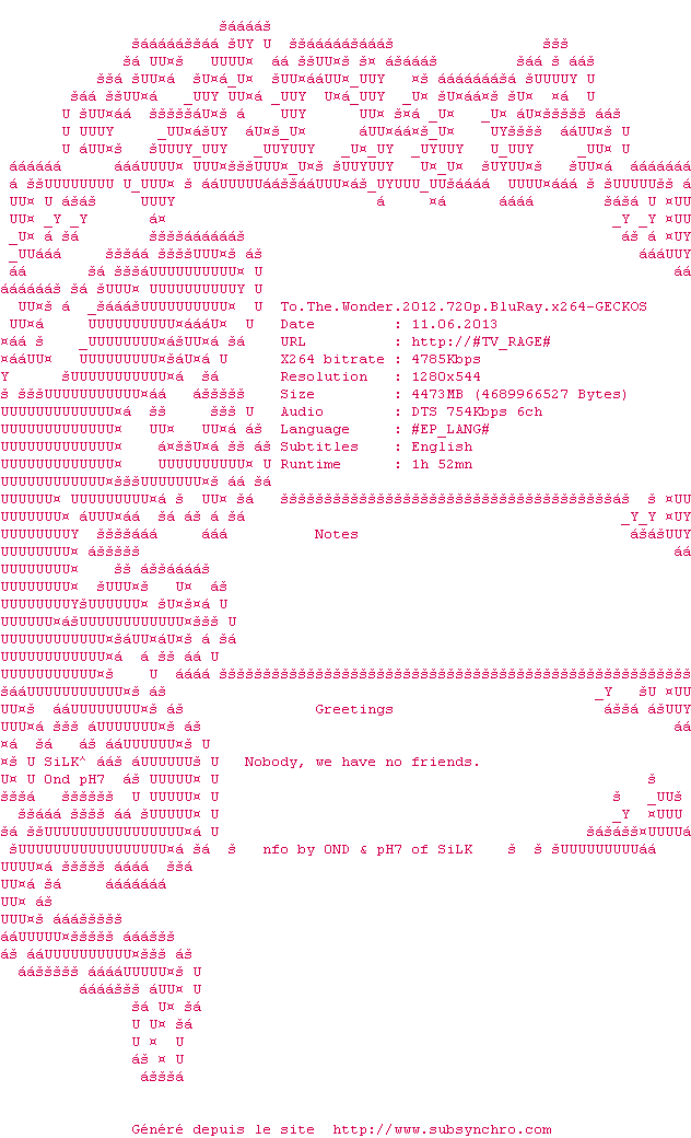 Telechargez le RSS « Fichier de la release To.The.Wonder.2012.720p.BluRay.x264-GECKOS »