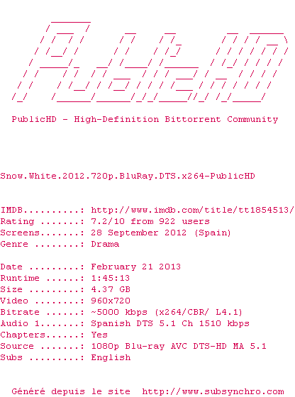 Telechargez le RSS « Fichier de la release Snow.White.2012.720p.BluRay.DTS.x264-PublicHD »