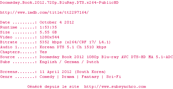Telechargez le RSS « Fichier de la release Doomsday.Book.2012.720p.BluRay.DTS.x264-PublicHD »