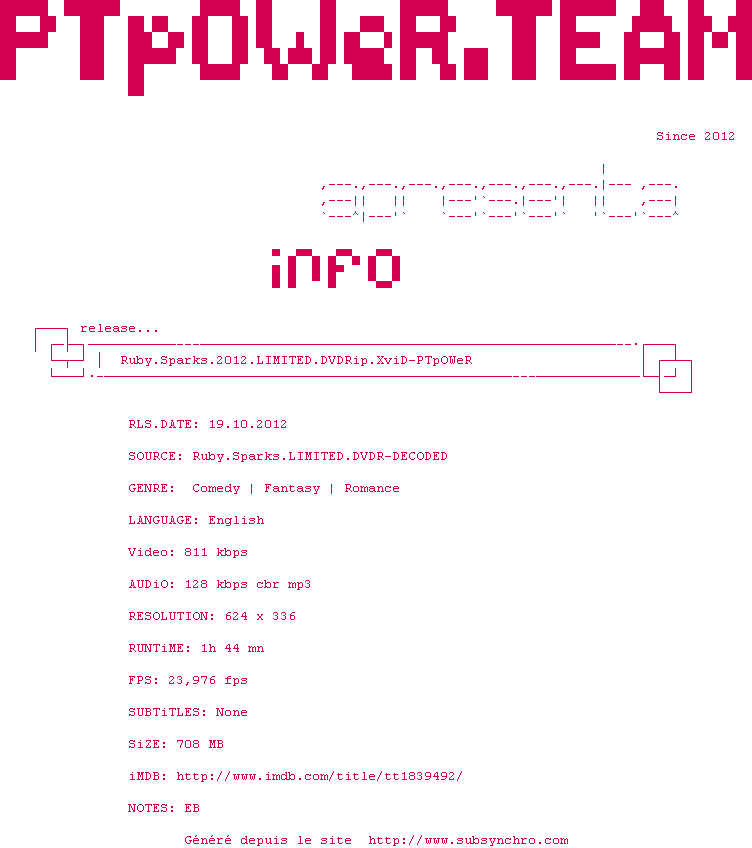 Telechargez le RSS « Fichier de la release Ruby.Sparks.2012.LIMITED.DVDRip.XviD-PTpOWeR »