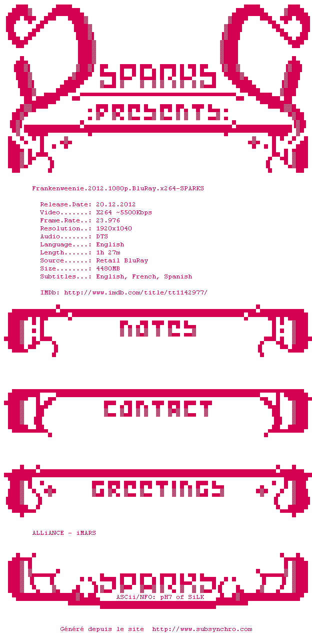 Y avez-vous pense ? Nous proposons déjà 1051 sous-titres pour le film Frankenweenie. Avez-vous essaye de voir si ces sous-titres etaient compatibles avec cette release ? On vous laisse le soin de tester cela pour nous et de contribuer au site en postant le sous-titre en cas de compatiblite constatee !
