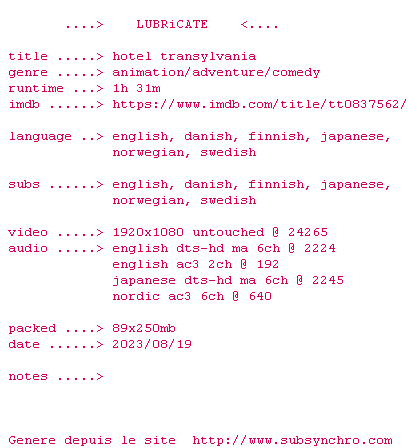 Y avez-vous pense ? Nous proposons déjà 7 sous-titres pour le film Hôtel Transylvanie. Avez-vous essaye de voir si ces sous-titres etaient compatibles avec cette release ? On vous laisse le soin de tester cela pour nous et de contribuer au site en postant le sous-titre en cas de compatiblite constatee !