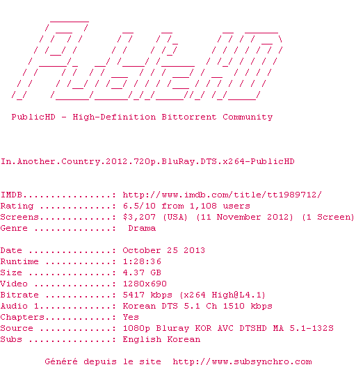 Telechargez le RSS « Fichier de la release In.Another.Country.2012.720p.BluRay.DTS.x264-PublicHD »