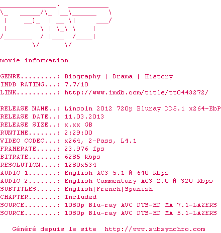 Telechargez le RSS « Fichier de la release Lincoln.2012.720p.Bluray.DD5.1.x264-EbP »