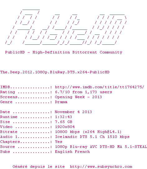 Telechargez le RSS « Fichier de la release The.Deep.2012.1080p.BluRay.DTS.x264-PublicHD »