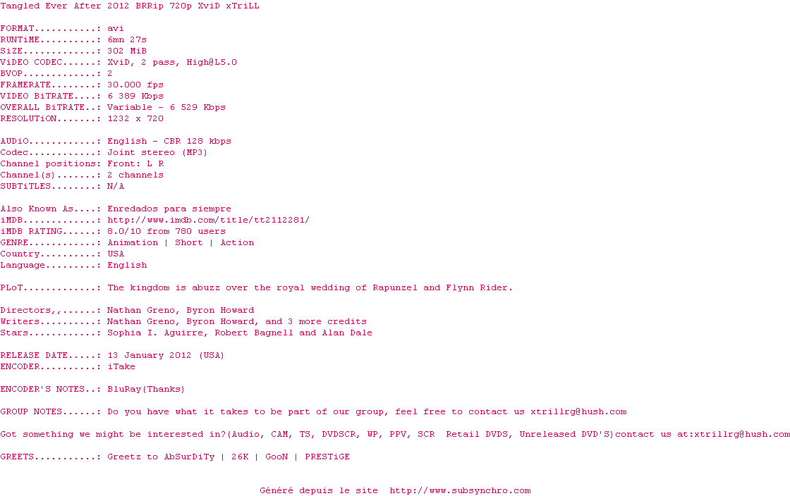 Telechargez le RSS « Fichier de la release Tangled.Ever.After.2012.BRRip.720p.XviD-xTriLL »