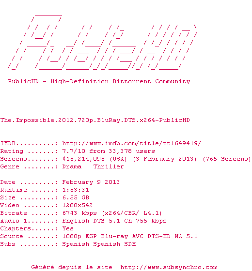 Telechargez le RSS « Fichier de la release The.Impossible.2012.720p.BluRay.DTS.x264-PublicHD »